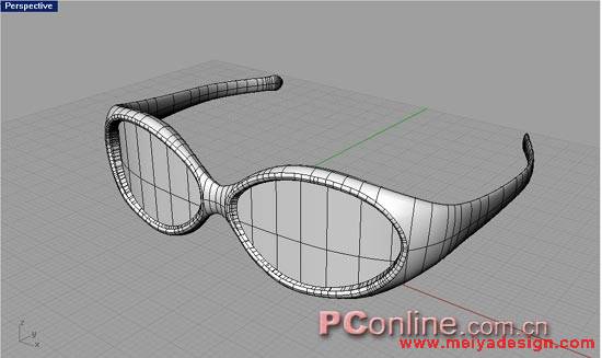 23.执行Surface>>Loft,命令提示Select curve to loft,选择如3-31所示的边,命令提示Select curve to loft.Press Enter when done,选择如3-32所示的边,右键确定,命令提示Adjust curve seams,右键确定弹出对话框,单击OK即可(如3-33所示),用同样的方法,在镜片的背面也形成一个loft面(如3-34和3-35所示)。 |