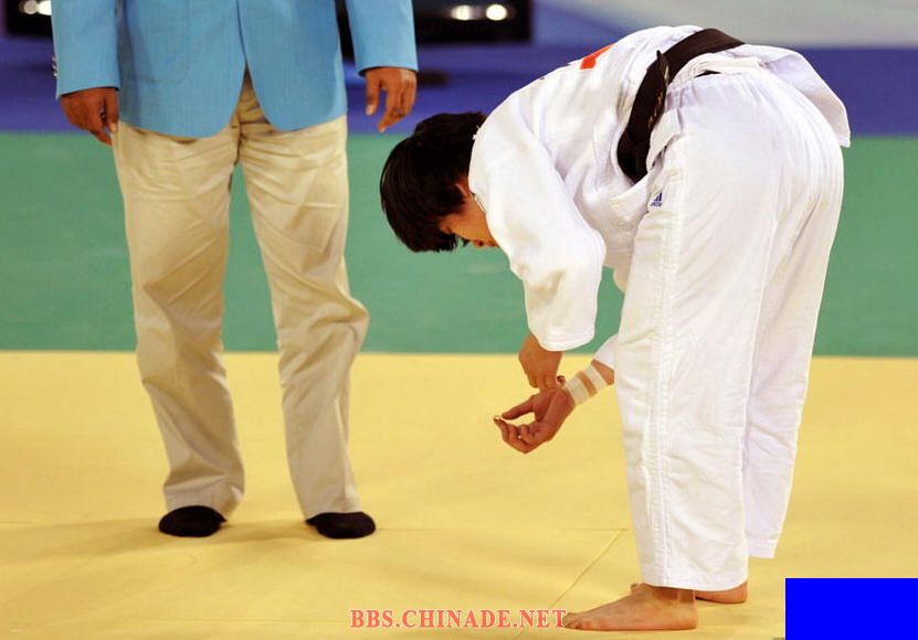 11月15日晚举行的柔道女子57公斤级决赛上,韩国选手金珍迪在较量中遗失了隐形眼镜,不得不暂停比赛四处寻找,最后被日本选手松本薰击败。图为韩国选手金珍迪找到了隐形眼镜。中新社记者柯小军摄